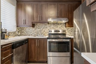Inclus : Luminaires, pôles, rideaux, stores, et hotte de cuisine.